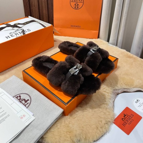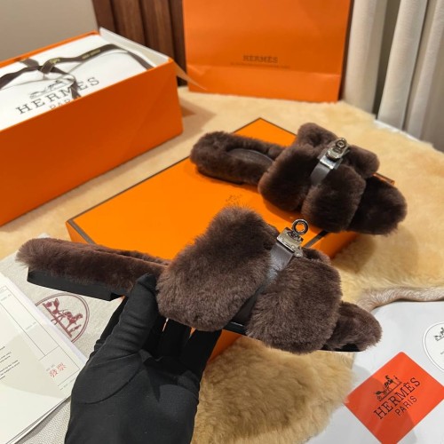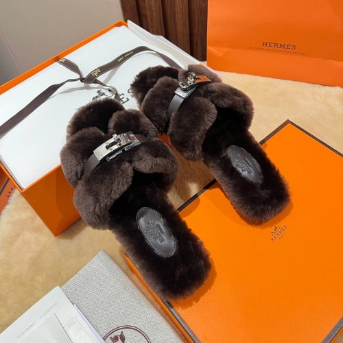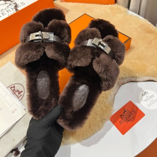 Коричневые тапочки Hermes из натурального меха. Главным акцентом в дизайне пары стала застежка Келли. Она гармонично сочетается с ремешком, надежно фиксирующим ногу. В нашем интернет-магазине вы можете купить копии тапочек с доставкой по Москве и по всей России.