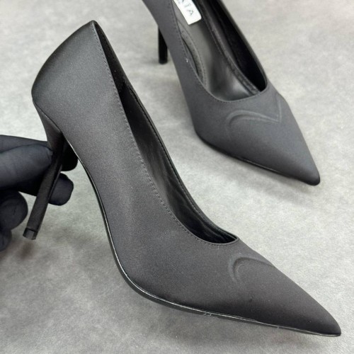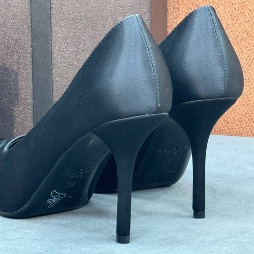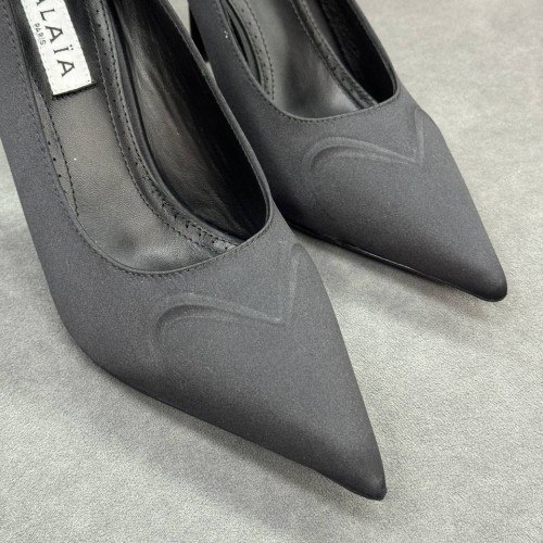 Элегантные черные женские туфли Alaia из ткани. Стильные туфли имеют острый носок и тонкий каблук шпильку, высотой 9 см. Удобный подъем подчеркивает изгибы щиколотки. В нашем интернет-магазине вы можете купить копии туфель с доставкой по Москве и по всей России.
