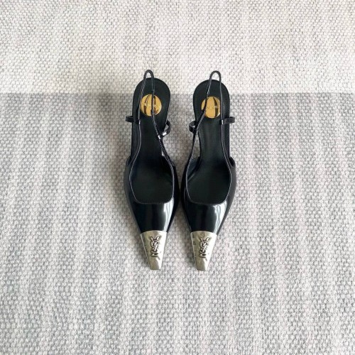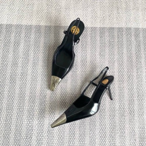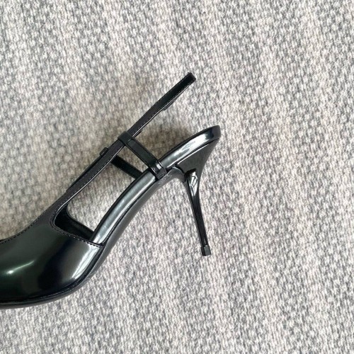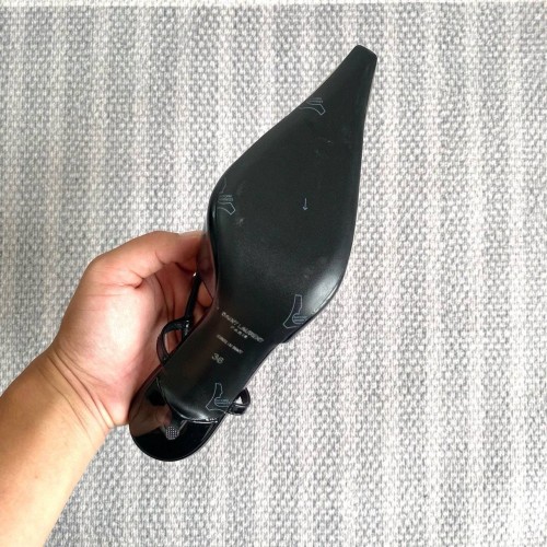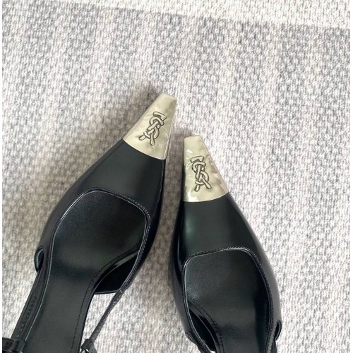 Черные женские туфли Saint Laurent из натуральной кожи. Элегантные туфли на тонком каблуке 8,5 см с открытой пяткой и заостренным серебристым носом. Ремешок с пряжкой регулирует посадку и не дает обуви соскользнуть со стопы. В нашем интернет-магазине вы можете купить копии туфель с доставкой по Москве и по всей России.