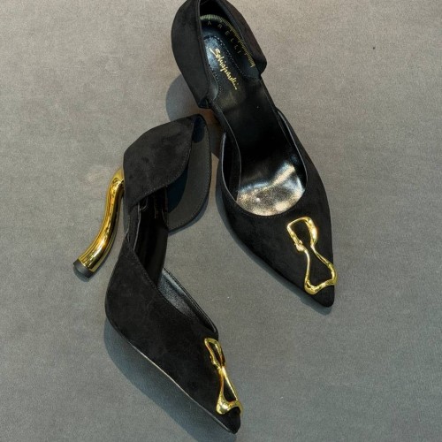 Элегантные черные туфли Schiaparelli из натуральной замши. Туфли, которые прямо сейчас притягивают больше всего внимания - яркие со скульптурным каблуком золотистого цвета и культовой пряжкой. Именно такие появились в новой коллекции Schiaparelli. В нашем интернет-магазине вы можете купить копии туфель с доставкой по Москве и по всей России.