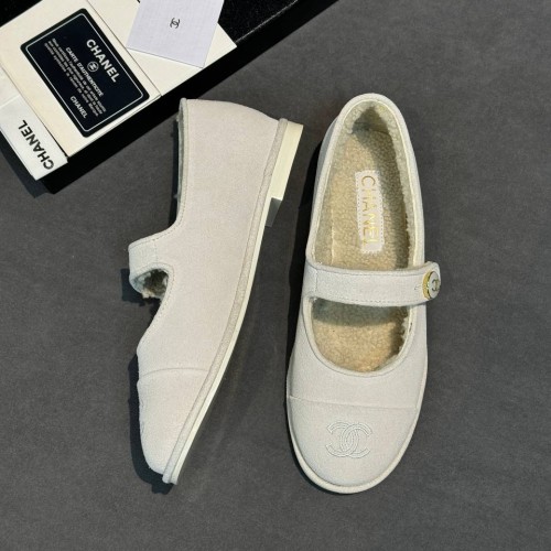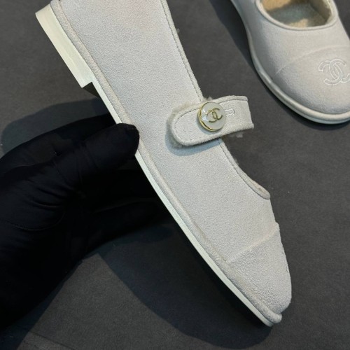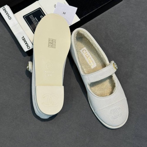 Белые женские балетки Chanel из натуральной замши и натурального меха. Модель выполнили из натуральной мягкой замши и дополнили ремешком, который обеспечивает надежную фиксацию и комфортную посадку по ноге. Чтобы обувь хорошо сохраняла тепло, подкладку и стельку выполнили из натурального меха. В нашем интернет-магазине вы можете купить копии балеток с доставкой по Москве и по всей России.