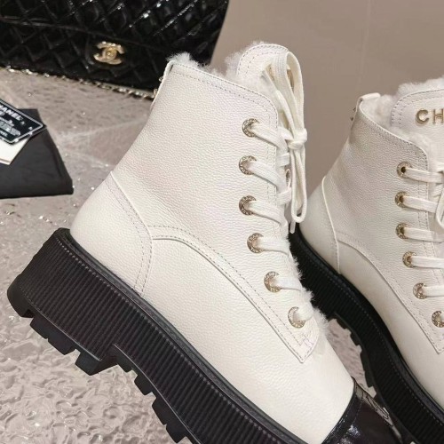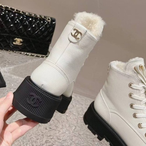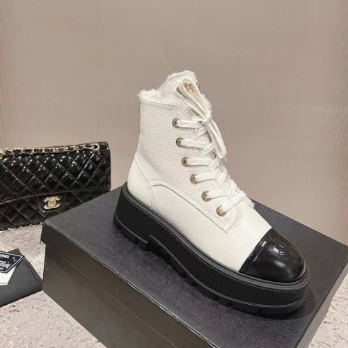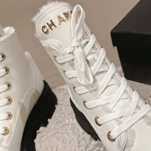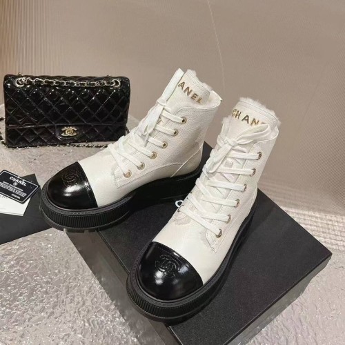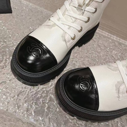 Черно-белые ботинки Chanel из натуральной кожи. Уютные зимние ботинки не только позволят вам собирать расслабленные городские образы, но и надежно защитят в зимние холода. Модель дополнена высокой подошвой с рельефными протекторами, удобной шнуровкой, меховыми стелькой и подкладкой, выходящей за края изделия, - все эти детали в совокупности делают ее максимально комфортной. В нашем интернет-магазине вы можете купить копии ботинок с доставкой по Москве и по всей России.