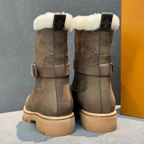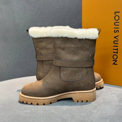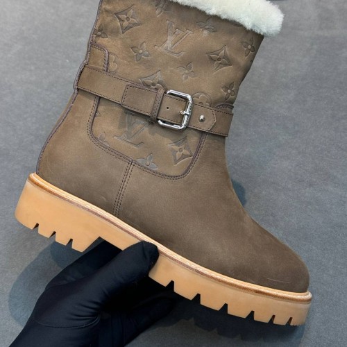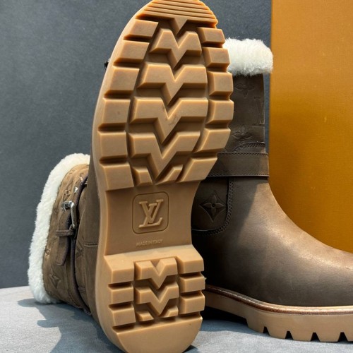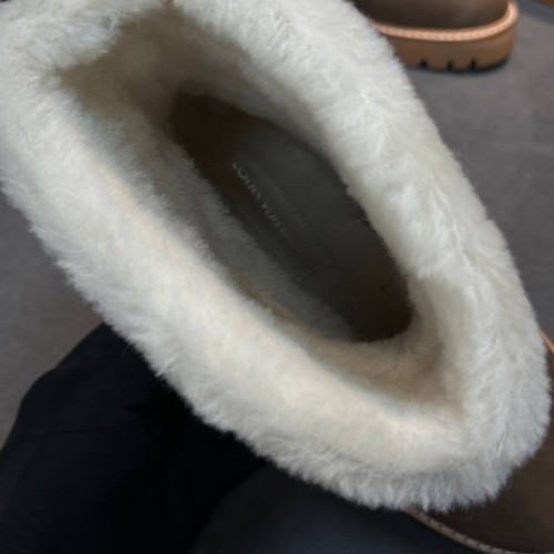 Коричневые зимние ботинки Louis Vuitton из натуральной кожи и овчины. Мех обеспечивает комфорт и тепло в холодный период. Модель с высоким голенищем, круглой носочной частью и облегченной подошвой элегантна и практична. В нашем интернет-магазине вы можете купить копии ботинок с доставкой по Москве и по всей России.
