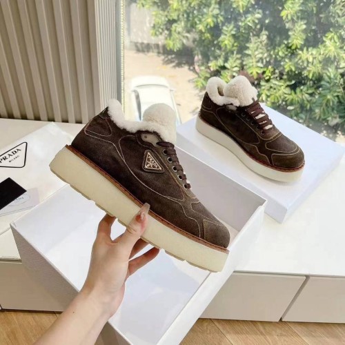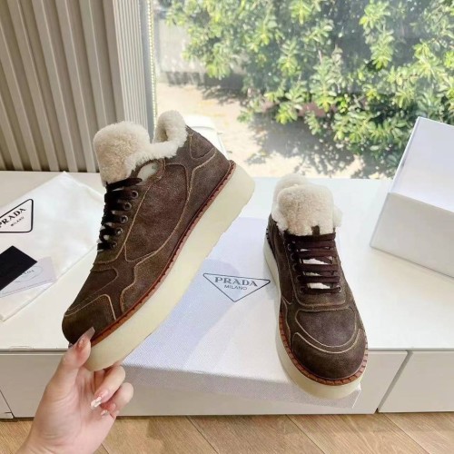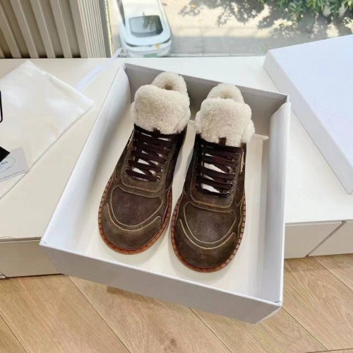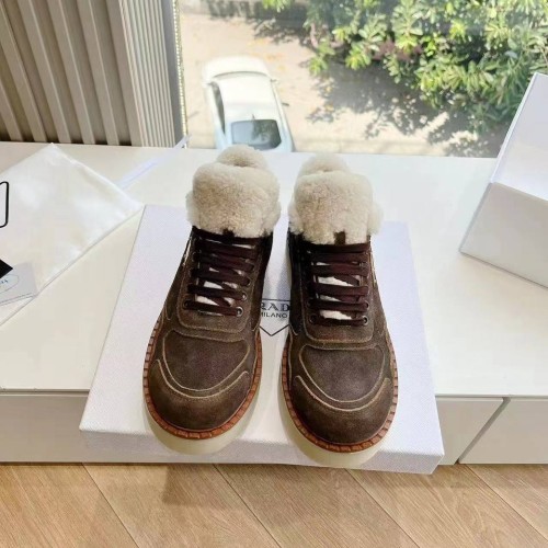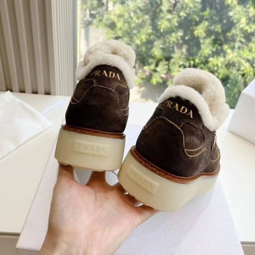 Зимние коричневые женские ботинки Prada из натуральной мягкой замши и меха. Удобные и универсальные ботинки, которые легко впишутся в ваш гардероб. За счет округлой носочной части, легкой подошвы, меха и фиксирующих шнурков вы будете чувствовать комфорт в течение всего дня. В нашем интернет-магазине вы можете купить копии ботинок с доставкой по Москве и по всей России.