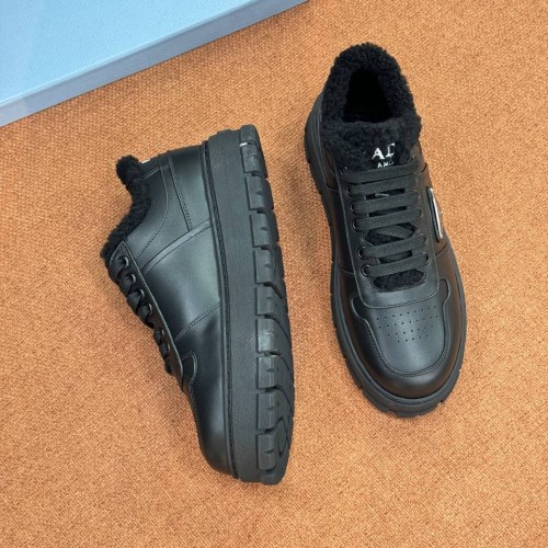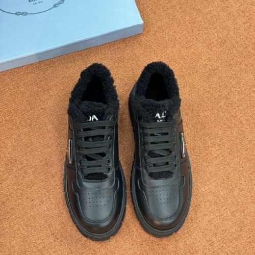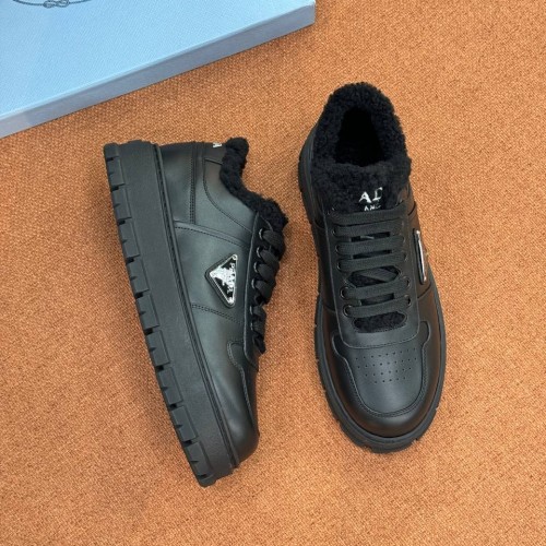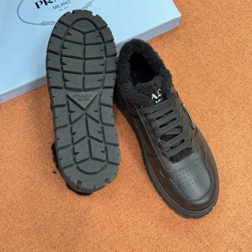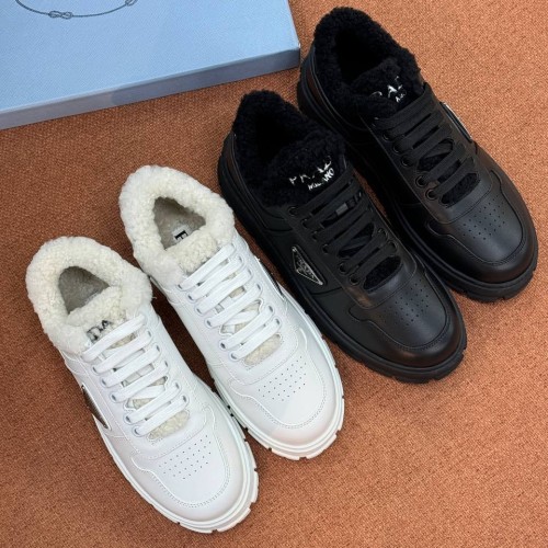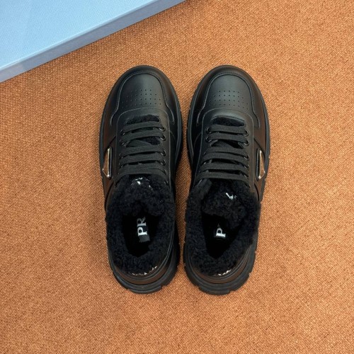 Черные женские зимние кеды Prada из натуральной кожи и меха. Стильная пара, которая поддержит любой базовый гардероб, и в которой будет комфортно в холодную переменчивую погоду. За идеальную посадку отвечают эластичная шнуровка и устойчивая подошва. В нашем интернет-магазине вы можете купить копии кед с доставкой по Москве и по всей России.