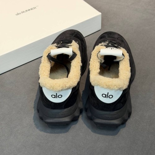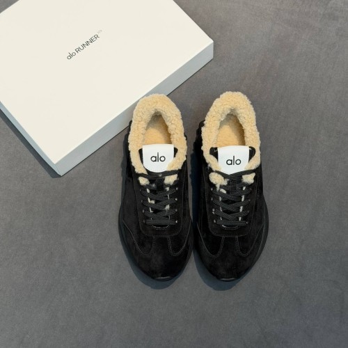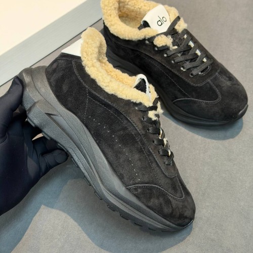 Черные женские кроссовки Alo из натуральной замши и овчины. Минималистичные кроссовки вне зависимости от трендов всегда остаются базой гардероба. Зимняя модель дополнена натуральным мехом, обеспечивающим надежную защиту от морозов. В нашем интернет-магазине вы можете купить копии кроссовок с доставкой по Москве и по всей России.