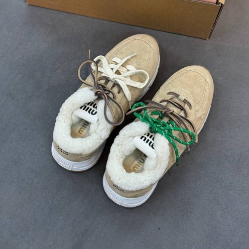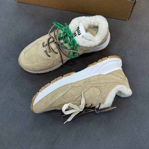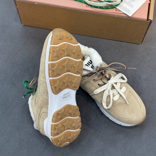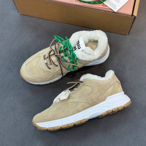 Бежевые кроссовки Miu Miu из натуральной замши и натурального меха. Выразительная фактура и лаконичный дизайн делают пару универсальной для гардероба. Устойчивая подошва, а также утепленные подкладка и стелька позволяют чувствовать себя комфортно на протяжении всего дня. В нашем интернет-магазине вы можете купить копии кроссовок с доставкой по Москве и по всей России.