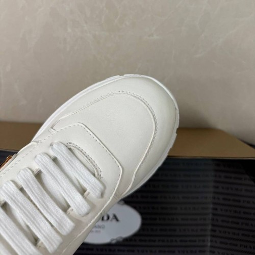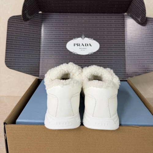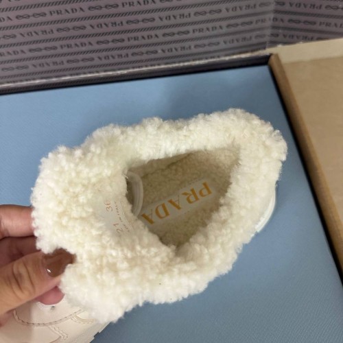 Белые женские кроссовки Prada из натуральной кожи и меха. Мягкий белый мех в тон паре позволяет чувствовать себя комфортно, даже если вы будете носить обувь весь день. Эксклюзивная металлическая фурнитура бренда украшает подошву обуви и привлекает внимание при ходьбе. В нашем интернет-магазине вы можете купить копии кроссовок с доставкой по Москве и по всей России.