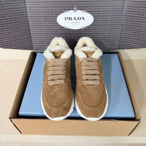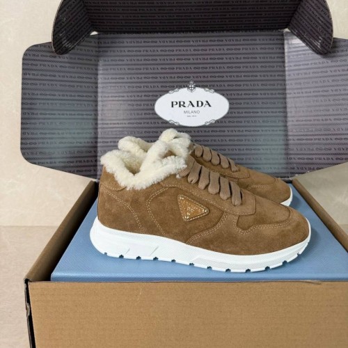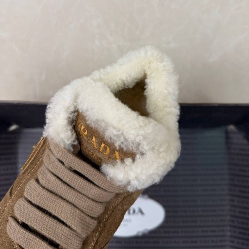 Светло-коричневые женские кроссовки Prada из натуральной замши и меха. В переменчивую погоду межсезонья ваш гардероб заслуживает модели в идеальном балансе стиля и комфорта. Устойчивая подошва и надежная шнуровка обеспечивают удобство, а современный дизайн позволяет сделать модель универсальным дополнением для большинства повседневных образов. В нашем интернет-магазине вы можете купить копии кроссовок с доставкой по Москве и по всей России.