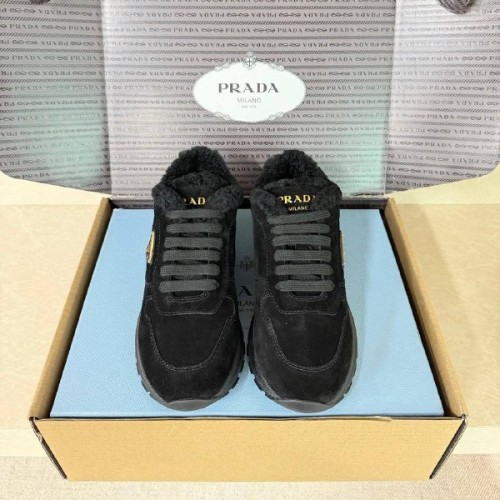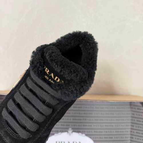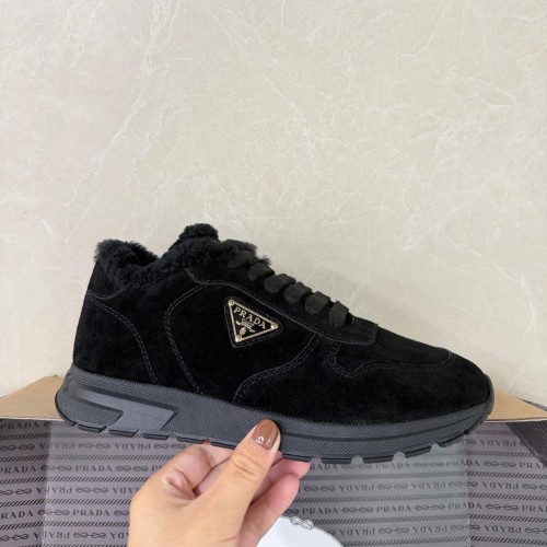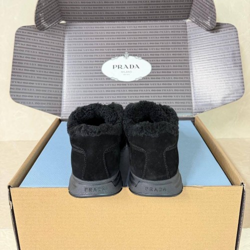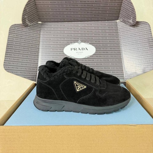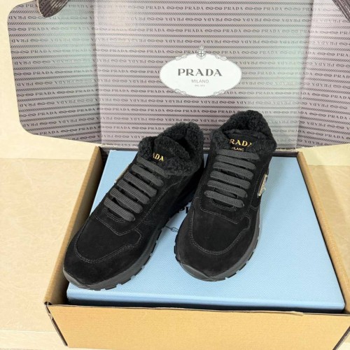 Черные женские кроссовки Prada из натуральной замши и меха. Модель из новой коллекции станет акцентом как в спортивном, так и в повседневном образе. Удобная шнуровка надежно фиксирует стопу, а мех сохраняет тепло. В нашем интернет-магазине вы можете купить копии кроссовок с доставкой по Москве и по всей России.