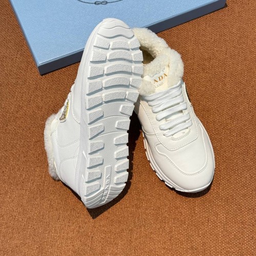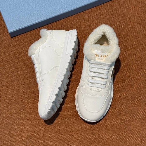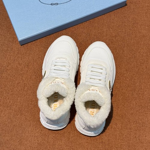 Белые женские кроссовки Prada из натуральной кожи и меха. Минималистичный дизайн и функциональность - это про кроссовки из новой коллекции, которые созданы для зимы в городе. Натуральная кожа позволит легко интегрировать модель в повседневные образы, а подкладка и стелька из натурального меха обеспечат тепло в холодную погоду. В нашем интернет-магазине вы можете купить копии кроссовок с доставкой по Москве и по всей России.