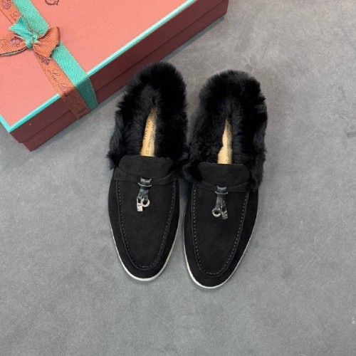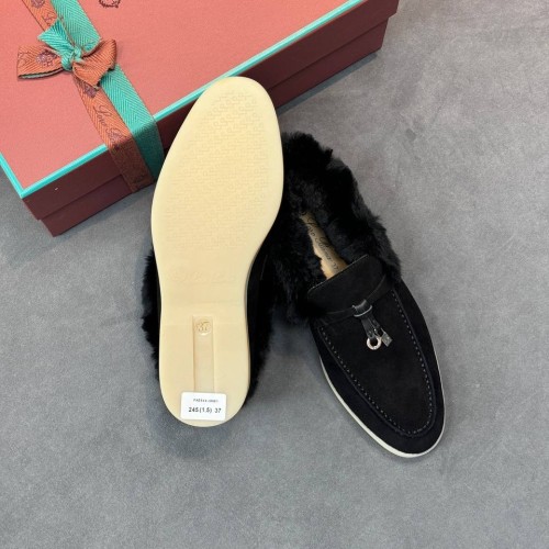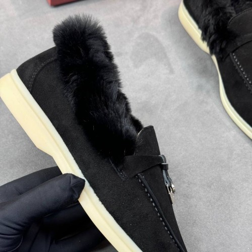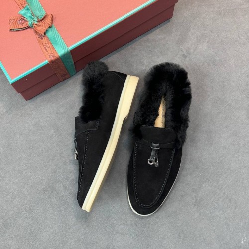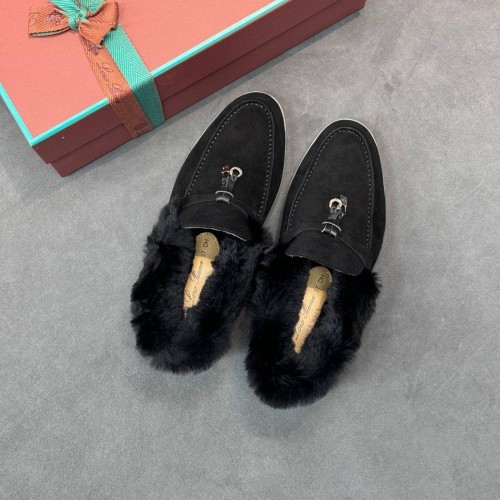 Зимние черные женские лоферы Loro Piana из натуральной замши и меха. Культовые лоферы с ремешком и миниатюрными подвесками My Charms. Пару дополнили невысоким широким каблуком, чтобы вам было удобно в течение всего дня. В нашем интернет-магазине вы можете купить копии лоферов с доставкой по Москве и по всей России.