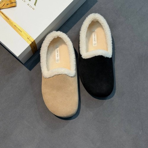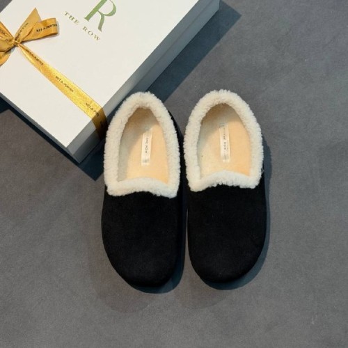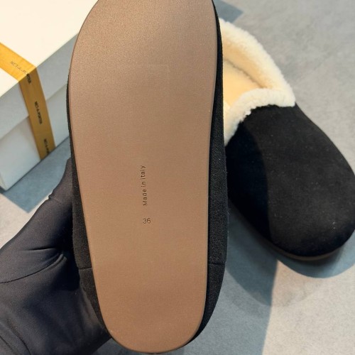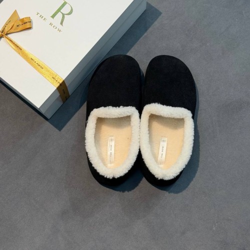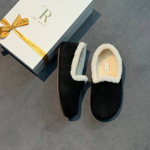 Черные зимние лоферы The Row из натуральной замши и меха. Самая уютная вариация лоферов для холодного времени года. Мягкая подкладка из натурального белого меха и плоский ход делают пару особенно комфортной. В нашем интернет-магазине вы можете купить копии лоферов с доставкой по Москве и по всей России.