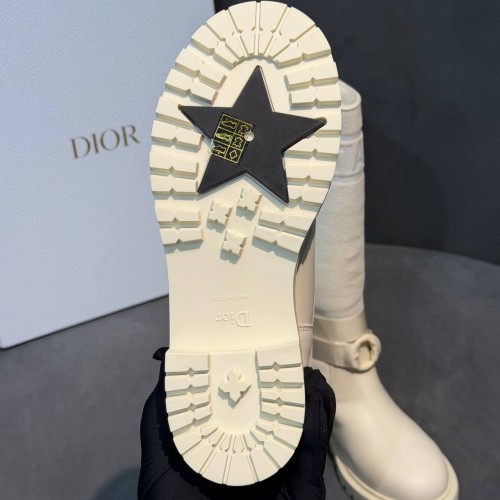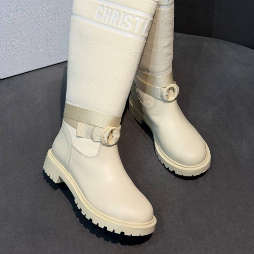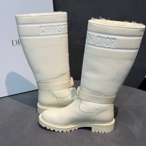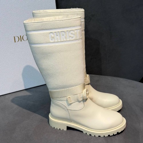 Белые зимние сапоги Christian Dior из натуральной кожи, ткани и овчины. Сапоги украшены вышитой лентой с надписью «Christian Dior Paris». Модель дополнена регулируемым ремешком на щиколотке и сверхлегкой зубчатой подошвой. В нашем интернет-магазине вы можете купить копии сапог с доставкой по Москве и по всей России.