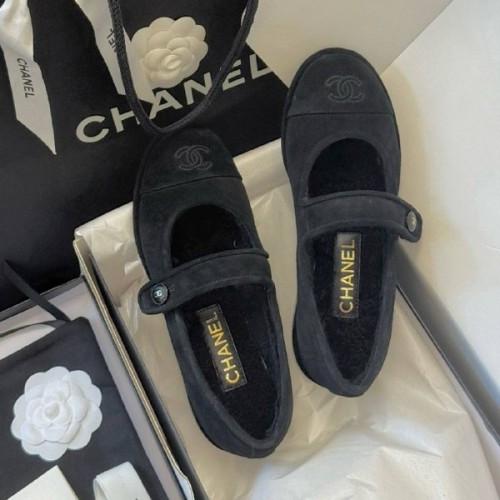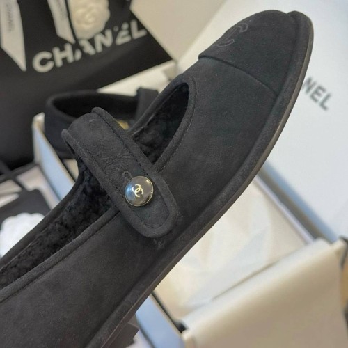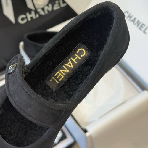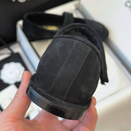 Черные женские туфли Chanel из натуральной замши и натурального меха. Одна из самых романтичных моделей в новой коллекции. Тонкий ремешок надежно фиксирует ногу, а натуральный мех обеспечивает удобство. В нашем интернет-магазине вы можете купить копии туфель с доставкой по Москве и по всей России.